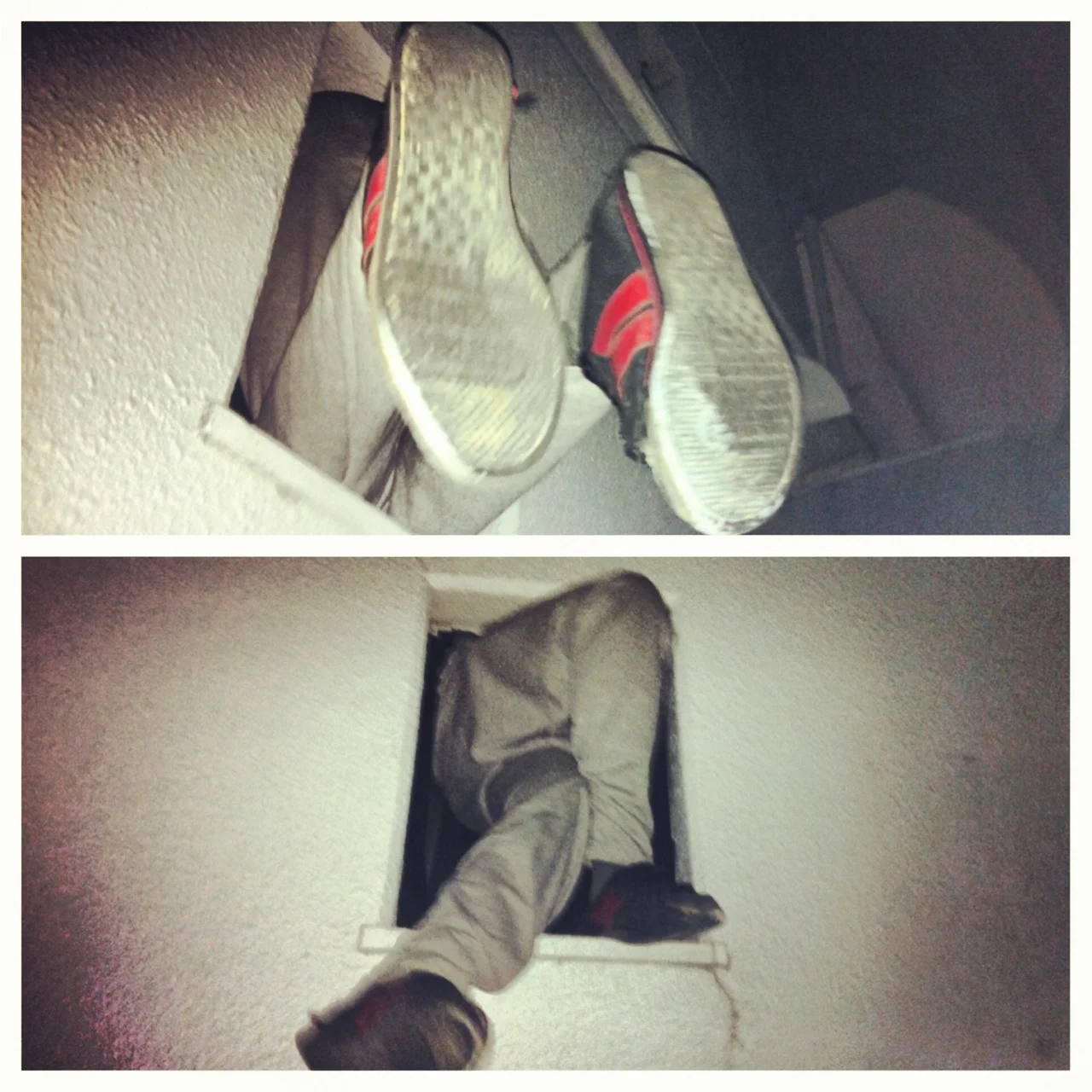 Yes, Tyler had the misfortune of locking himself in the bathroom tonight. The situation is made even more toilsome by the fact that the only escape (aside from the door that had jammed) is a tiny window. I repeat, a TINY window. After contemplating for a solid 45 minutes, in a freezing bathroom, with no tools to aid in an exit, he thought to himself the best option was to go out through the window. How this actually happened is a bit of a blur. Somehow Tyler wriggled himself out, feet first, landing to the parking lot below. Now, even though we are the bottom floor, we still have to go up a flight of stairs. So not only did flattening himself out just to squeeze through the small opening prove troubling, he had to do that and! land from about 10 feet.