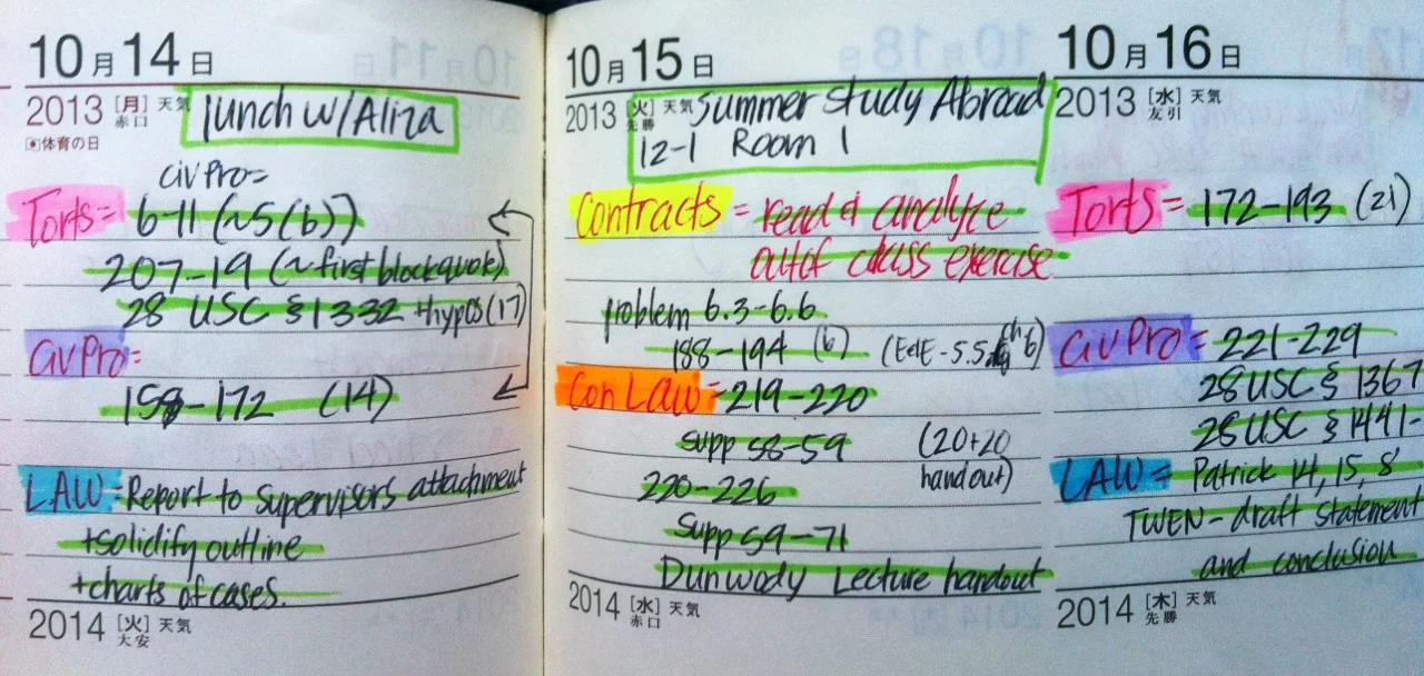 What’s law school like?? More reading than you could ever possibly imagine… Other than that, not too bad. Color coding either helps to keep me sane or is just the beginning of my obsessive compulsive disorder. Tyler MacBethOctober 20, 2013 Facebook0